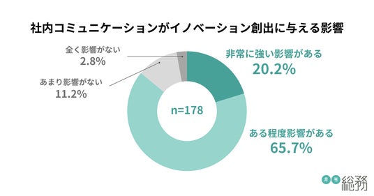 社内コミュニケーションがイノベーション創出に与える影響をどう感じるか尋ねたところ、8割以上が「影響がある」と回答しました(n=178)。