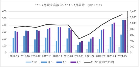 一般社団法人白馬村観光局(所在地:白馬村北城7025、代表理事:伊藤英喜)は、2024-25冬季シーズンの観光客入込数データを分析した結果、11~2月末に白馬村を訪れた観光客が前年比114%の約130万人となり、昨シーズンに続き2004-05シーズン以降の最高値記録を更新したことをお知らせいたします。また、同期間の村内スキー場来場者数は延べ89万人以上で、そのうち46%がインバウンド観光客だったことがわかりました。
