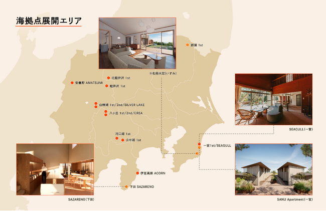 一宮には既存拠点の「SEAGULL一宮」(SANU Renovation series)があり11月には新建築モデル「SANU APARTMENT」がついにオープンし、海ローケーションでは初となる大型拠点が誕生。いすみ・下田には遊休別荘を活かした「SANU Renovation series」が展開され、友達家族を我が家に招くように大人数でも楽しめる拠点が完成します。