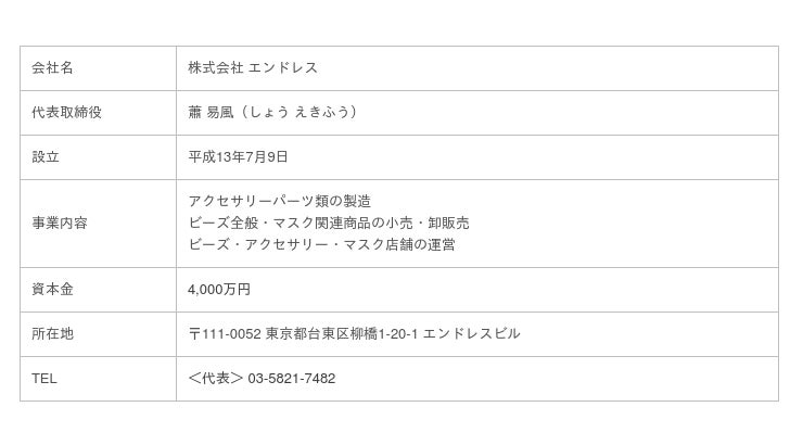 ビーズ・アクセサリーパーツを取り扱うショップ「PARTS CLUB(パーツクラブ)」を全国約90店舗運営する株式会社エンドレス(本社:東京都台東区、代表:代表取締役 蕭(しょう)易風(えきふう))は、マスク専門ブランド「MASK CLUB(マスククラブ)」を立ち上げ、7月7日(火)に「MASK CLUB」オンラインストアをオープンしました。