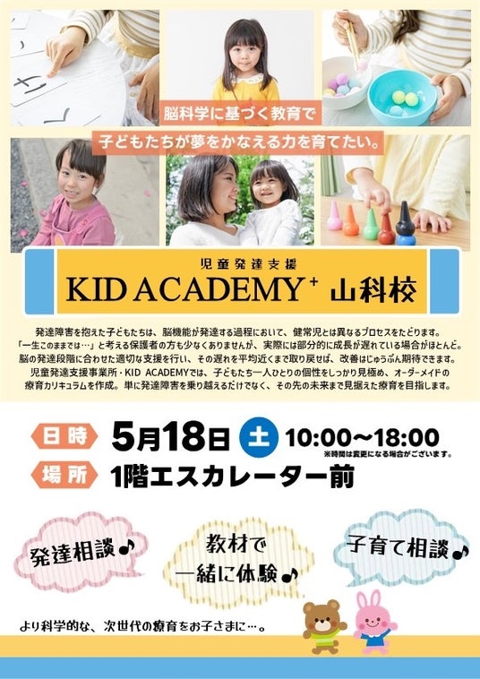 イオンタウン山科椥辻の正面入口1階エスカレーター横にて、KID ACADEMY⁺山科校のイベントが開催されます。KID ACADEMY⁺山科校は、今年1月に開校した児童発達支援事業を展開するKID ACADEMYのフランチャイズ校です。