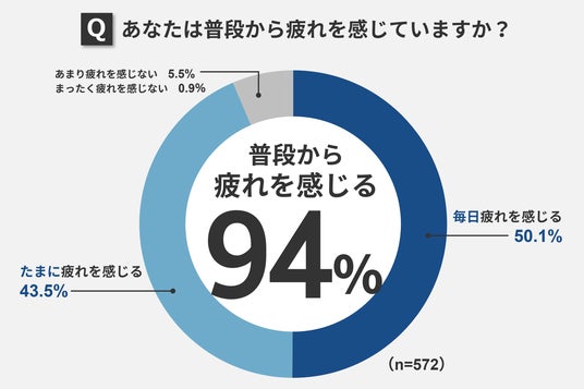 回答者全員への「あなたは普段から疲れを感じていますか?」という質問では、「毎日疲れを感じる」(50.1%)、「たまに疲れを感じる」(43.5%)、「あまり疲れを感じない」(5.5%)、「まったく疲れを感じない」(0.9%)という結果となりました。「毎日疲れを感じる」と「たまに疲れを感じる」を合わせた「普段から疲れを感じている」お父さんは93.6%となり、第1回目の調査から毎回9割を超えています。
