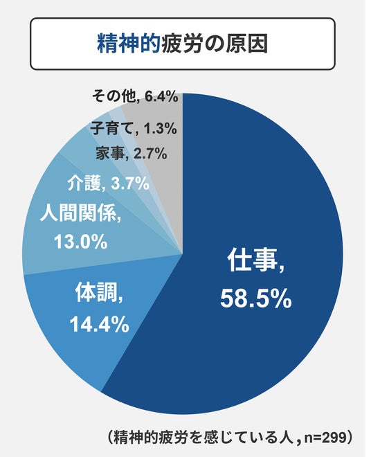 「精神的疲労(「身体的・精神的疲労どちらも」も含む)」と回答した人に「主な原因は何ですか?」と質問したところ、1位は身体的疲労を感じているお父さんと同じく「仕事」(58.5%)でした。