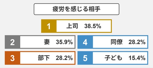 3番目に多い「人間関係」(13.0%)と回答した人に疲労を感じている相手は誰か質問したところ、TOP5は「上司」、「妻」、「部下」、「同僚」、「子ども」という結果になりました。
