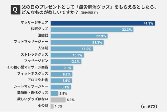 回答者全員に父の日のプレゼントとして「疲労解消グッズ」をもらえるとしたら、どんなものが欲しいか質問したところ、多かった順に「マッサージチェア」(41.9%)、「快眠グッズ」(33.3%)という結果になりました。