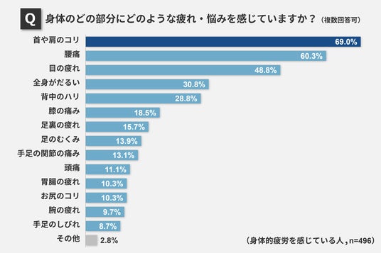 (3)身体的疲労の原因は主に「仕事」、最も疲れを感じやすいのは「首や肩のコリ」