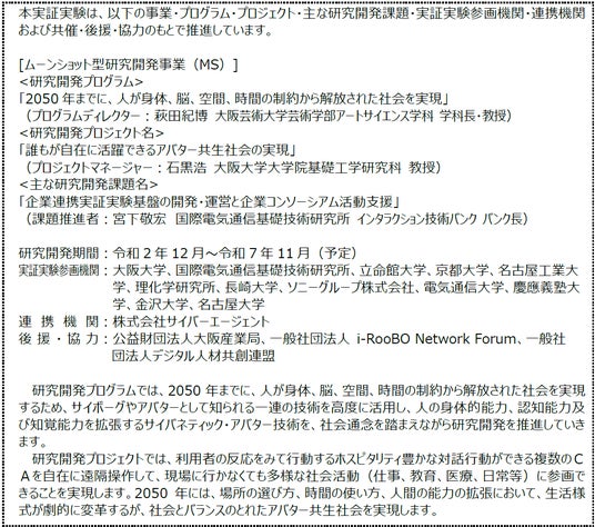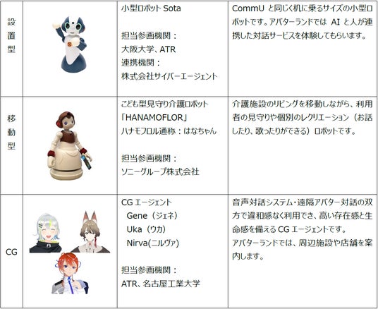 この度の実証では、ATRが参加するムーンショット型研究開発事業の一環として、「アバターランド」の多地点連携拠点のうち、東京拠点として参加します。「アバターランド」では、サイバネティック・アバター(略称CA:遠隔操作ができるロボットアバターやCGアバター)(注2)が、大阪・東京・九州など全国の各所に配置され、配置されている周辺施設、店舗などの案内、実証プロジェクトの紹介など実験的なサービスを実施いたします。