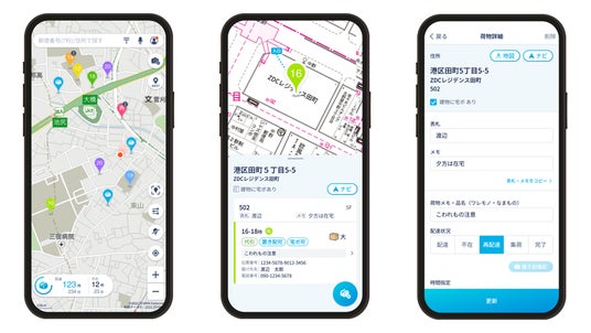 ・配達荷物は、住所・郵便番号の入力や伝票撮影により簡単に登録可能で、配達完了・不在・再配達などのステータスを地図上で一元管理できます。