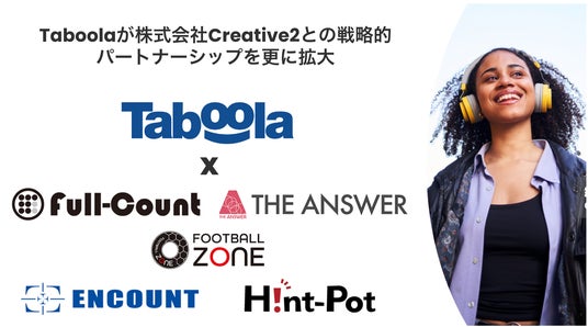 本日2024年11月20日、ディスカバリープラットフォームの世界的最大手であるTaboolaは、株式会社Creative2(以下Creative2)との戦略的パートナーシップを更に拡大し全5サイトにおいて連携することを発表しました。2022年より協業を開始した日本最大級のベースボール専門メディア「Full-Count(フルカウント)」、サッカー専門メディア「FOOTBALL ZONE(フットボールゾーン)」、2023年より協業を開始したスポーツ総合メディア「THE ANSWER(ジアンサー)」に加え、エンタメ総合メディア「ENCOUNT(エンカウント)」と、ライフスタイル情報の発信メディア「Hint-Pot(ヒントポット)」との連携も開始しました。このパートナーシップのもと、Creative2は、Taboolaが提供するコンテンツディスカバリープラットフォームを全サイトにて複数年独占的に活用し、幅広いユーザー層に、パーソナライズされたコンテンツ体験および最適化された広告をお届けします。(*1)