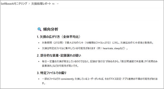 SelfBaseのAIによるデータ取得支援機能は、被験者ごとのデータ取得状況をAIが監視し、計測漏れや異常値を検知してアラートや示唆を提示します。