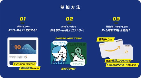 本イベントでは、LifeFitの新公式キャラクター「ラフィット」と「タートレ」の2チームに分かれ、ジム利用やリワード交換などの“ケンコーアクション”でチームの勝利を目指します。