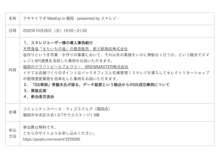このたび、福岡にて10月26日にアキナイラボの第一回オフラインMeetupを開催いたします。