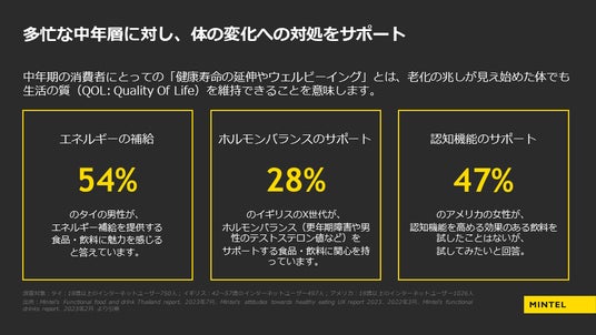 「中年期の消費者にとっての『健康寿命の延伸やウェルビーイング』とは、老化の兆しが見え始めた体でも生活の質(QOL: Quality Of Life)を維持できることを意味します。」としたうえで、ミンテルがアメリカで行った消費者調査のデータを参照しながら、従来男性向けのカテゴリーであったエナジードリンクは、マルチタスクのサポートや、疲労と戦うためのエネルギー補給として、中年層の女性からもニーズがあると説明しました。