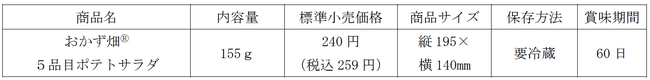 今回、新たに発売する「おかず畑(R) 5品目ポテトサラダ」は、お客様の「ポテトサラダはより具材感がほしい」というお声から開発されました。人気メニューであるポテトサラダに、枝豆・コーンなどの人気具材を加えることで、「多品目」という価値をさらにプラスした「おかず畑」ならではの商品です。