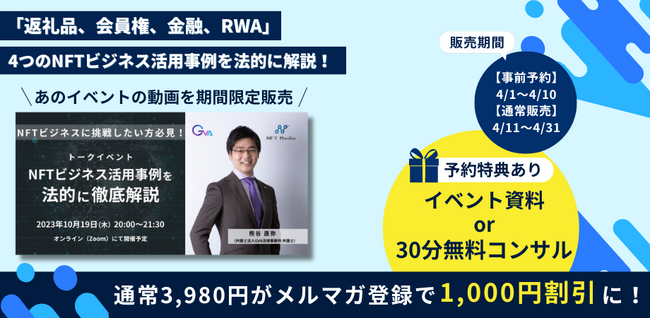 事前予約限定特典では、GVA法律事務所とNFT Mediaの30分無料オンライン相談(どちらかのみ選択も可能です)やイベント資料PDFを受け取ることができ、無料相談ではご自身のビジネスについてのご相談が可能!