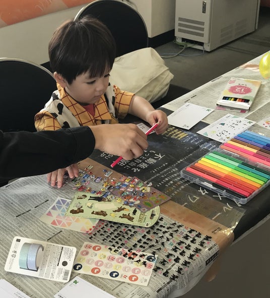当社の名刺と同様のデザインの名刺を使い自分の名前を記入してデコレーションをしてもらったりなどオリジナルの名刺づくりの体験をしました。子供たちの顔とお名前を記載した社員証を作成していたものをお渡しし、首からかけてもらいました。運営したスタッフ社員も、子供たちのお顔がうつったひらがなの社員証をつけている子供たちを目にし、とても癒される時間となりました。