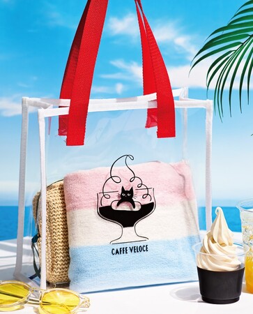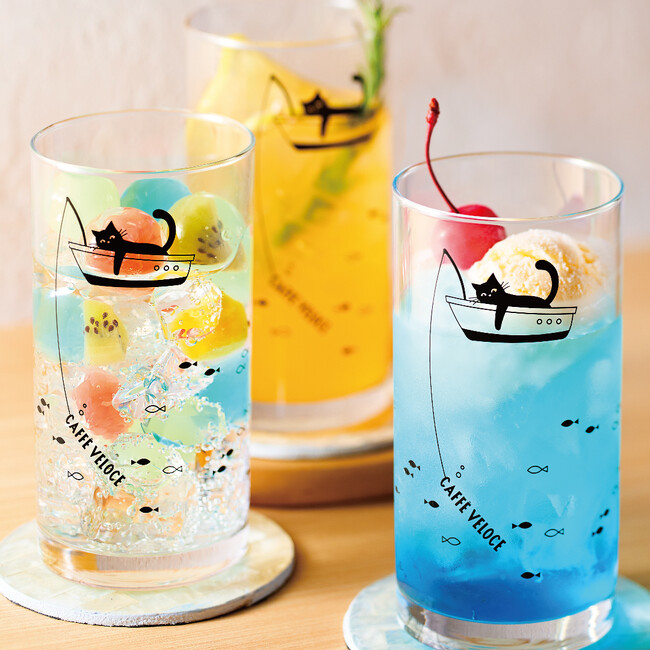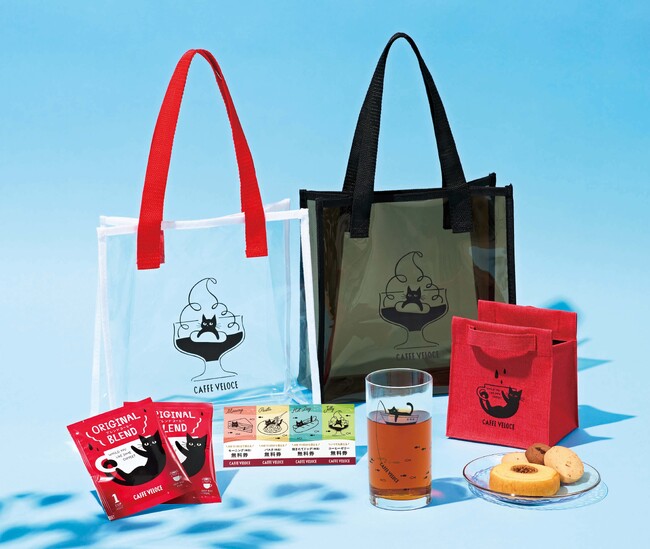 黒ねこクリアバッグは、クリアレッドとクールブラックの2色を展開。バッグには、夏らしい黒ねこのオリジナルイラストがプリントされ、『カフェ・ベローチェ』で長年愛される「コーヒーゼリー」を海に、ソフトクリームを入道雲のように見立てて描かれています。黒ねこが浮き輪に乗って、海にぷかぷか浮かぶ姿がとても可愛らしいです。黒ねこグラスは、船に乗って、魚が釣れるのを待つ姿を描いた夏らしいデザインを施しました。中に注ぐドリンクの色によっては、飲み切るまで何が釣れたかが分からない、お楽しみ要素が入っていることもポイントの一つです。そのほか、ドリップバッグやバームクーヘンなどの焼き菓子が入った小物入れや、モーニングやパスタ、コーヒーゼリーといったフードメニューが楽しめる無料券4枚分など、盛りだくさんのアイテムがセットになっています。