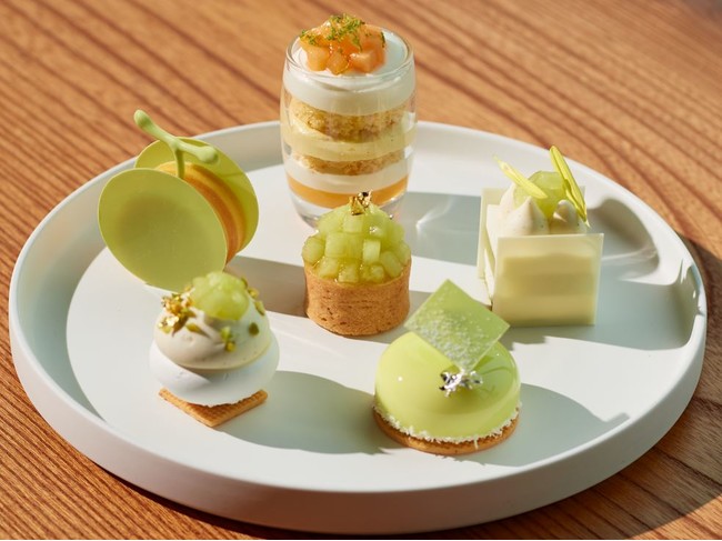 お皿の中心で清らかに美しく存在感を放つのはメロンのタルトです。香ばしいタルトにメロンの果実感を残し、一口でしっかりとした青肉メロン特有のフレッシュさと爽やかな後味が続きます。赤肉メロンのジュレを使ったショートケーキからは、小さなグラスの中に6層にも重ねられた構造美をご覧ください。シャンティクリームとカスタードクリームの2種のクリームとスポンジケーキに、深い甘みの赤肉メロンジュレを重ね、芳醇な甘美が何層にも広がるショートケーキに仕上がりました。また、愛くるしいメロンを象るのはメロンチョコレートで創られたメロンオペラケーキで、美味しさはもちろん見た瞬間にほっこりと笑顔を誘うスイーツです。