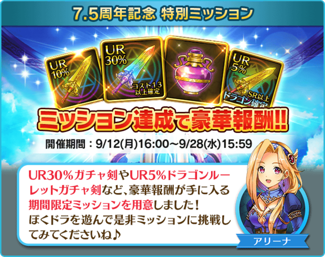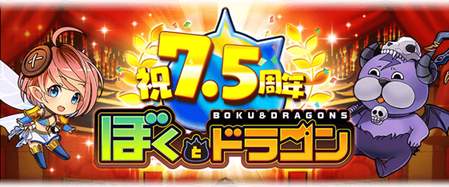 株式会社ドリコム(本社:東京都品川区、代表取締役社長:内藤裕紀、以下「ドリコム」)のグループ会社の株式会社スタジオレックス(本社:東京都品川区、代表取締役社長:粕田澄人、以下「スタジオレックス」)提供の新感覚スマホRPG『ぼくとドラゴン』が本年9月12日(月)に、サービス開始7.5周年を迎えたことを記念し、『7.5周年記念キャンペーン』を実施することをお知らせいたします。
