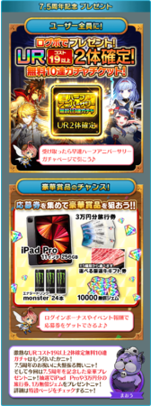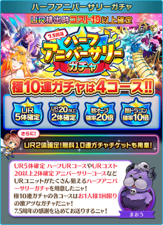 他にも「ハーフアニバーサリー無料10連ガチャチケット」で引ける、URコスト19以上が2体確定の超お得な「ハーフアニバーサリー無料10連ガチャ」などを用意しています。