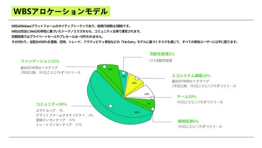 また、WBSのステーキングを開始し、新規ユーザー向けの高収益特典や友人招待キャンペーン、オンラインプロモーションを実施、それに加え、収益拡大施策として、ローンチプールやゲーム収益分配システムを導入し、投資スタイルに応じた3大ステーキングプール「スプラッシュ・プール」「ビッグウェーブ・プール」「ゼニス・プール」を展開する。更に、市場の信頼向上と価格の安定を目的に、四半期ごとの$WBSの買い戻し計画を実施する予定である。