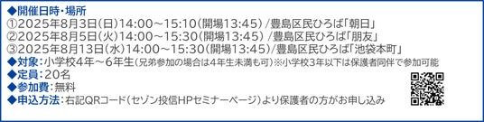 セゾン投信株式会社(本社:東京都豊島区、代表取締役社長:園部鷹博)は豊島区の地域コミュニティ拠点である区民ひろば「朝日」 「朋有」 「池袋本町」3会場にて小学生を対象とした金融教育イベント「気まぐれLunch Time(ランチタイム)」を開催いたします。本イベントでは、セゾン投信の協力会社が高校や大学の金融教育の現場で取り入れている金融教育ゲームを体験いただけます。夏休みの自由研究にもそのまま活用できる内容となっておりますので、「自由研究のテーマ、どうしようかな」とお悩みの親御さまにもおすすめです。