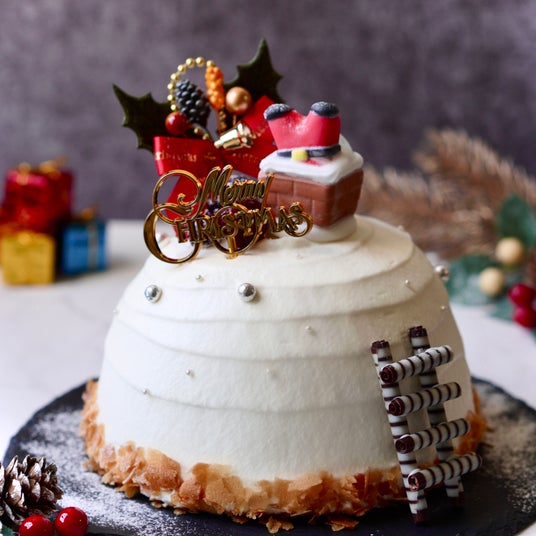 ベリーとレアチーズのドームケーキサンタさんがケーキの上に上ったような雰囲気を演出したケーキ。