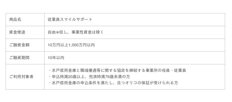 地域顧客の支援を目的とした本商品は、水戸信用金庫と職域優遇等に関する協定を締結する事業所の役員・従業員を対象としており、ご融資金額は最大1,000万円、ご融資期間は最長10年までご利用いただける利便性の高い商品です。