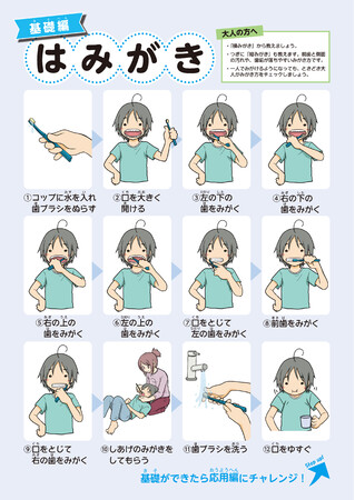 このポスターは、1.入浴、2.洗顔、3.歯みがきの手順とコツを、わかりやすいイラストとことばでまとめています。