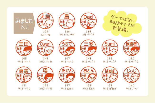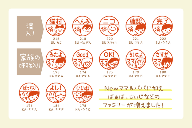 「パパです」「ママです」の呼称入りや、「済」がデフォルトで入ったタイプを増やしました。