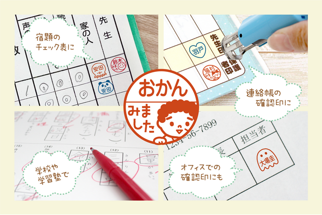 2023年1月に販売開始した「みましたスタンプ」。お子さまの連絡帳や音読カードのサイン、塾や学校の先生が提出物に押す確認印に使える、かわいいイラスト入り印鑑です。回覧板のサインやオフィスでのチェック印などにもオススメです。