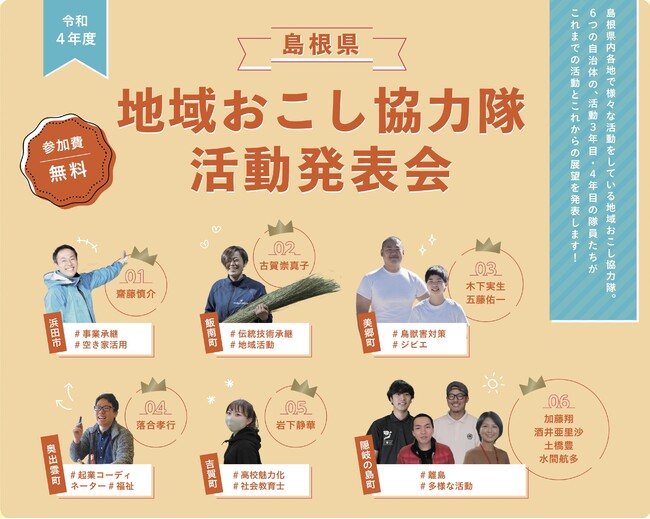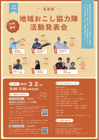 島根県で活躍する地域おこし協力隊の活動発表会が2023年3月2日(木)、島根県立大学浜田キャンパスおよびオンラインにて開催します。主催はふるさと島根定住財団で、県立大学の西嶋一泰研究室が共催。初開催の昨年はオンラインのみで、現地開催は初めての試み。