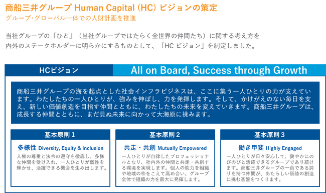 株式会社商船三井(社長:橋本剛、本社:東京都港区、以下「当社」)は、経営計画「BLUE ACTION 2035」にあわせて、当社グループの人財政策に関する基本的な考え方を示す「商船三井グループ Human Capital (HC) ビジョン」(以下「HCビジョン」)を策定しました。
