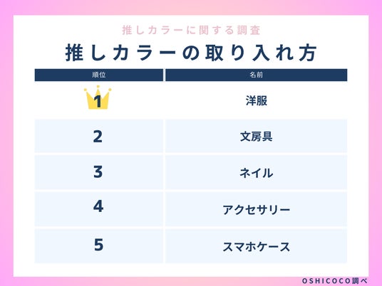 上記ランキング以外にも、バッグやヘアカラー、コスメ、部屋の小物類などに推し色を取り入れるといった回答がありました。