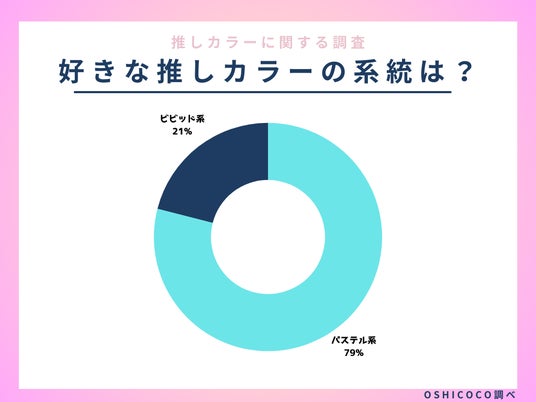 次に、推しカラーの系統調査では、パステル系79%、ビビッド系21%と、パステル系を好む推し活層が多い結果に。