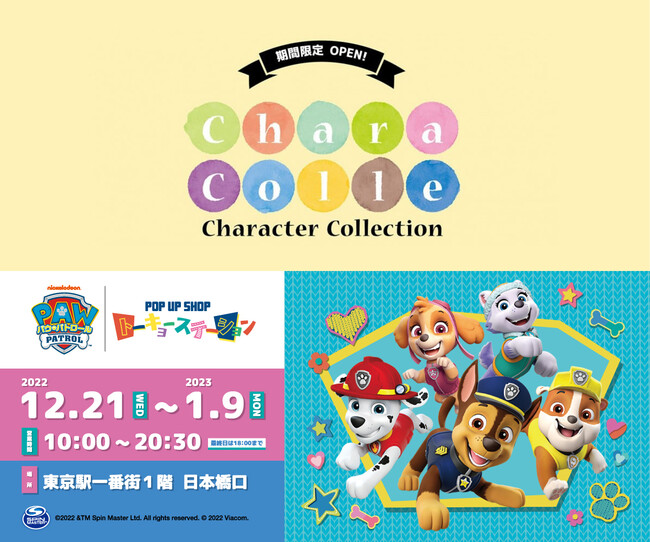 株式会社マリモクラフト(本社:東京都江戸川区 代表取締役社長:酒井 修)は、東京駅一番街1F日本橋口にて期間限定POPUP SHOPのキャラコレを運営しております。今回は世界中の子供たちに大人気の3DCGアニメ『パウ・パトロール』の期間限定ショップ「パウ・パトロール POP UP SHOP@トーキョーステーション」を2022年12月21日(水)から1月9日(月)までの期間限定でオープンいたします。