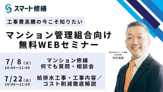 マンションやビルなど大型建物の修繕工事の見積、工事支援サービスを展開する株式会社スマート修繕(本社:東京都港区)は、マンション区分所有者様を対象にした無料のWebセミナーを開催します。