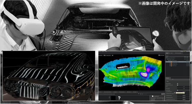 従来は自動車製造工場などで、ヒトが車体のキズなど現場までいって目視で確認しなければならなかったものを、3D-MeasureVerseではゴーグルをかけて仮想空間に入ると、ゼブラパターンが投影された車体ボディが表示され、現場で車体ボディの傷などチェックしているのと同じ状態を目の前で確認することができます。
