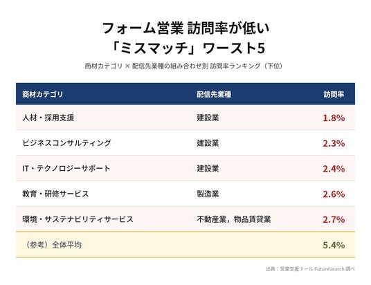 また、教育・研修サービス × 製造業(2.6%)、環境・サステナビリティサービス × 不動産業(2.7%)も低訪問率を記録しました。いずれも業種の実務に関連する提案が含まれていましたが、不動産業はフォーム営業全体での訪問率が3.8%と低い業種であること、製造業は研修よりも加工技術や素材といった生産に直結する提案への反応が高い傾向にあり(4位・6位参照)、研修テーマとの相性が相対的に低い可能性があります。