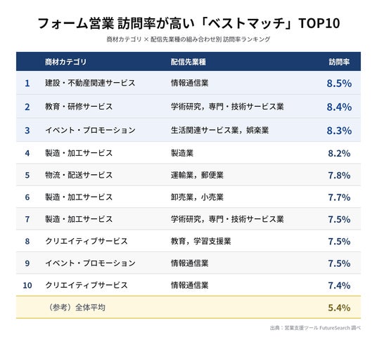 TOP10を俯瞰すると、特定の商材カテゴリが複数の業種で高い訪問率を記録している傾向が見えてきます。製造・加工サービスは3枠(4位・6位・7位)、クリエイティブサービスは2枠(8位・10位)、イベント・プロモーションも2枠(3位・9位)を獲得しました。