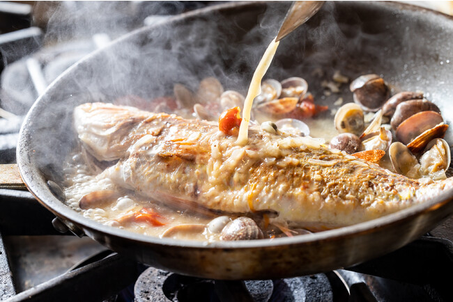 メインカウンターにはアイスベッドを設置し、当日届いた新鮮な海の幸を直接選び「アクアパッツァ」や「グリル」等の調理法を選んで、自分だけのカスタマイズされたオーダーをお楽しみいただけます。