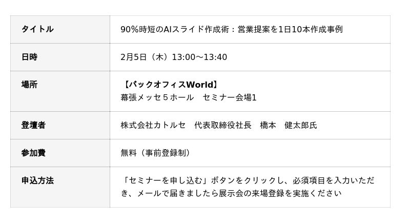 2026年2月5日(木)に幕張メッセにて開催の「バックオフィスWorld」にて、株式会社カトルセ代表取締役社長の橋本健太郎がセミナーに登壇致します。