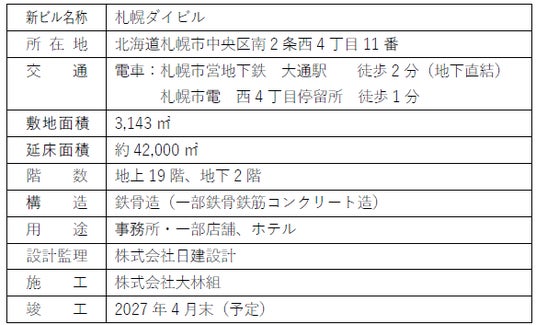 ダイビル株式会社(社長:丸山卓、本社:大阪市北区、以下「当社」)は、当社がかねてより再開発プロジェクトを推進しております札幌ダイビル(以下「本物件」)について、札幌市より「ゼロカーボン推進ビル」に認定されたことをお知らせします。