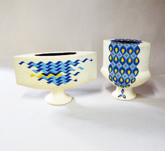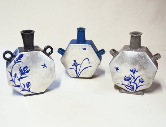 釉瓷漣文扁壷、彩瓷羽文扁壷