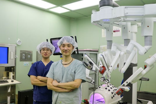 手術支援ロボットの最新機種で、アームに取り付けた鉗子3本と、内視鏡1本を用いて遠隔操作で手術が可能。モニターも見ながら操作する執刀医の手の動きに連動し、手ぶれ防止の機能も備えている。切開創が小さいため出血量が少量で、患者の身体への負担が少なく(低侵襲)、感染リスクも低減。執刀医もイスに座って操作が可能なため、長時間の手術でも負担を軽減できるメリットがある。