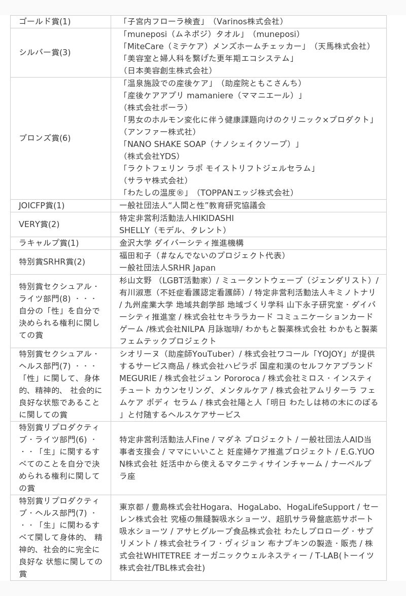 ~ゴールド賞に「子宮内フローラ検査」 SRHR理念普及を目的に「性」や「生」に関わる優れた取り組みを表彰~