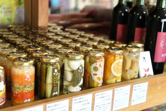 お土産処 なごみ地元世羅のお菓子やワイン、ピクルスなどの特産品を販売しています。イベント期間の花に合わせた可愛い花雑貨を取りそろえています。