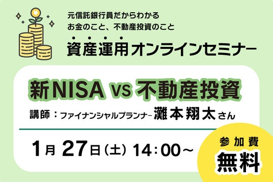 将来の資産運用方法に悩む方におすすめのセミナーです。講師に元信託銀行員、現ファイナンシャルプランナーの灘本翔太さんをお招きします。新NISAと不動産投資の比較を通じて、元信託銀行員だからわかるお金のことを分かりやすく解説していただきます。