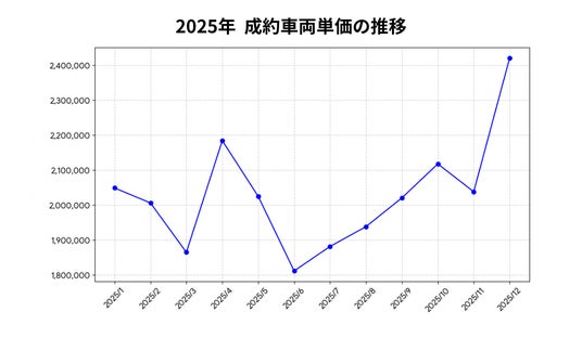 2025年で最も特筆すべきは、12月の急騰です。前月の約203.7万円から、一気に2,419,871円へと跳ね上がりました。年末の在庫確保を急ぐ全国のプロバイヤー様による激しい入札競争が、平均単価を押し上げたことが主因と考えられます。セルカのプラットフォームが、市場の熱量をダイレクトに価格へ反映させる仕組みとして機能していることが証明されています。
