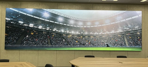 最初の図柄は、明治安田生命がJリーグ全体のタイトルパートナーであることから、試合で盛り上がるサッカースタジアムの写真となりました。通常、この大きさの電飾は背面にLEDを多数並べますが、光の透過性が高いLUFASはフレーム内側の上下だけで足りるので、省エネにも貢献します。床を緑色にし、完成すればピッチの中にスタジアムが浮かび上がる仕掛けです。ビジュアルは季節によって変え、1月は富士山、春は桜、秋は紅葉――などが予定されています。布が簡単に張り替えられる国際特許構造を活かした展開で、同社からも「『利用者がワクワクして、アイディアが湧き出る会議室』というコンセプトにピッタリだ」と喜ばれました。